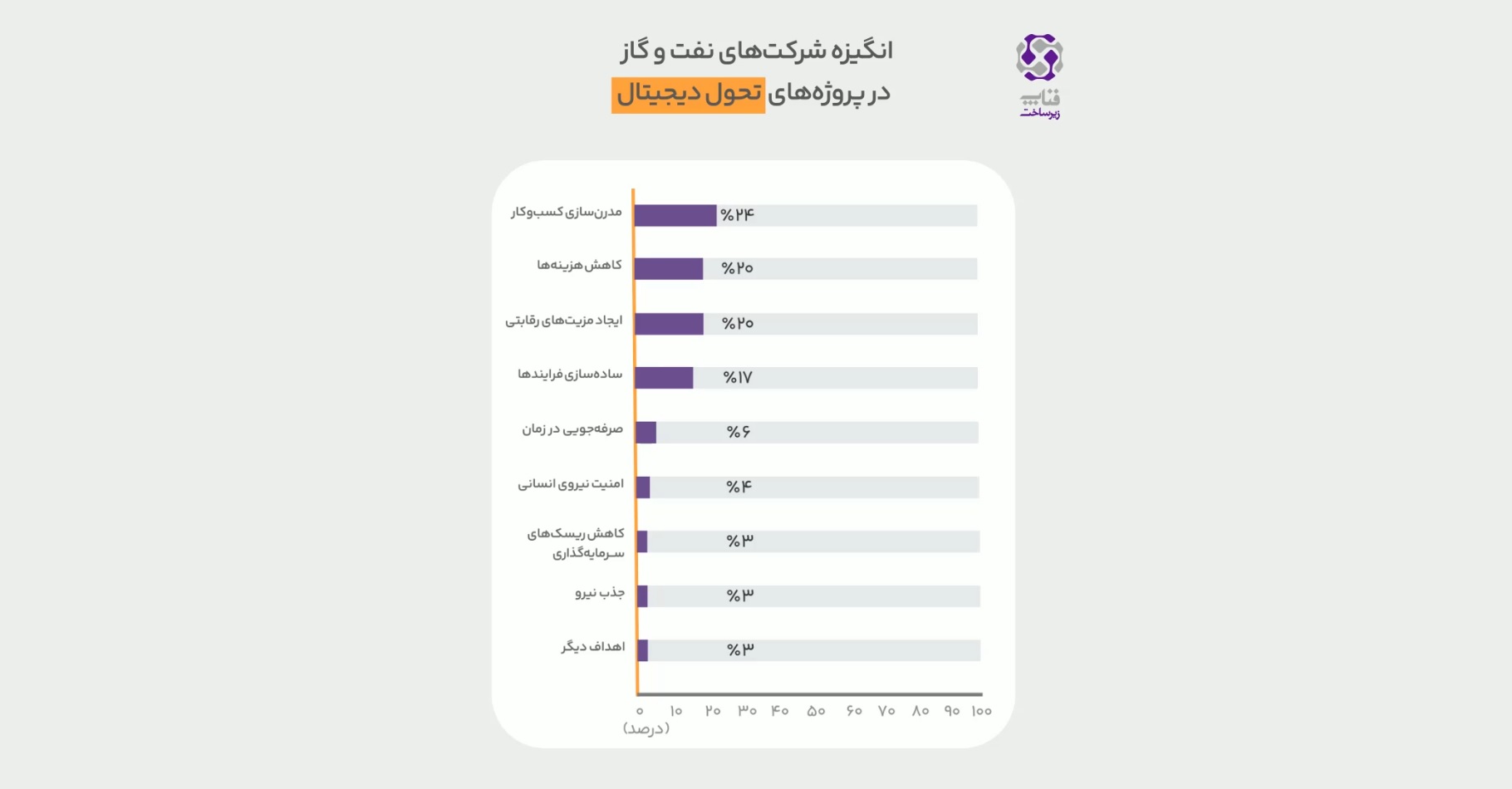 در این زمینه موسسههای Oil & Gas IQ و Open text در یک برنامه پژوهشی مشترک با 200 متخصص صنعت نفت و گاز از شرکتهای معتبر دنیا مصاحبه کردهاند و مسائلی مانند اولویت استفاده از ابزارهای دیجیتالی در شرکتهای نفت و گاز، هدف شرکتهای نفت و گاز در پروژههای تحول دیجیتال، وضعیت شرکتهای نفت و گاز در اتخاذ برنامههای دیجیتال، و تغییرات مثبت تحول دیجیتال در شرکتهای نفت و گاز را بررسی کردهاند. از جمله در این مطالعه انگیزه شرکتهای نفت و گاز برای آغاز پروژههای تحول دیجیتال مورد بررسی قرار گرفته است. همانطور که در نمودار بالا میبینید به ترتیب مدرنسازی کسبوکار، کاهش هزینهها، ایجاد مزیتهای رقابتی و سادهسازی فرایندها از مهمترین انگیزههای شرکتهای نفت و گاز برای آغاز پروژههای تحول دیجیتال عنوان شده است.